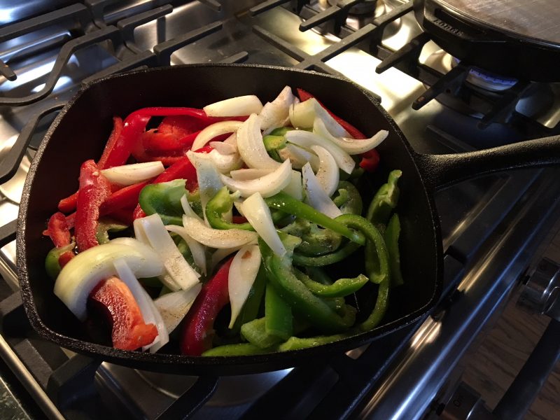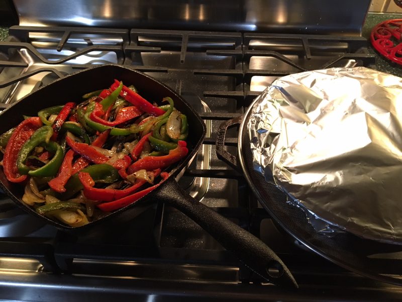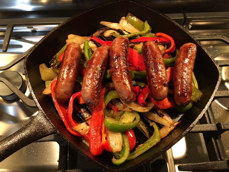 When sausages are done (if you put them on first, they will be done around the same time as the peppers and onions.) Remove the from skillet and cover to rest with tin foil.