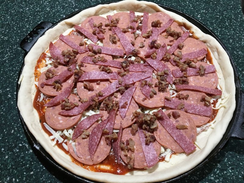 Add the meat next, on this one I used what you see in the picture. 2 kinds of salami, and cooked crumbled bacon from Costco. Put the meat on first, then the veggies, then the final topping of cheese.