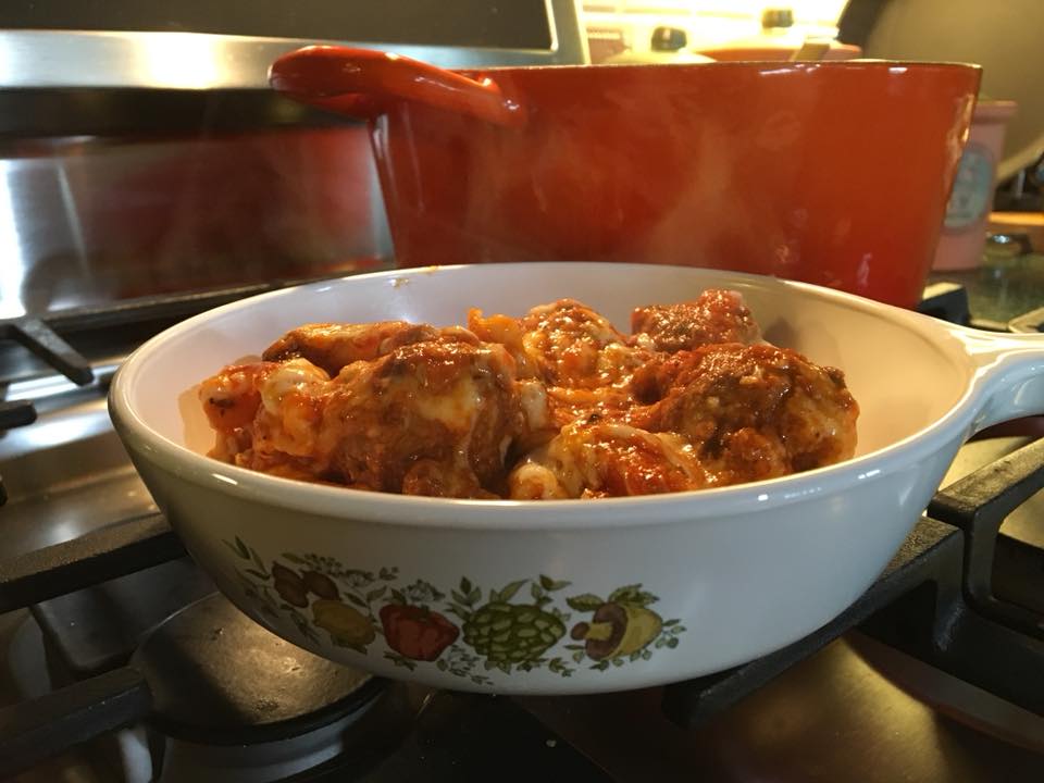I had frozen uncooked meatballs in the freezer… thawed them, put them in a jar of spaghetti sauce, and simmered for 3 hours. Added some salt, pepper and garlic powder. Cooked some pasta, added it to the cooked noodles. Covered in shredded cheese and baked until golden. VERY good!! Simple!