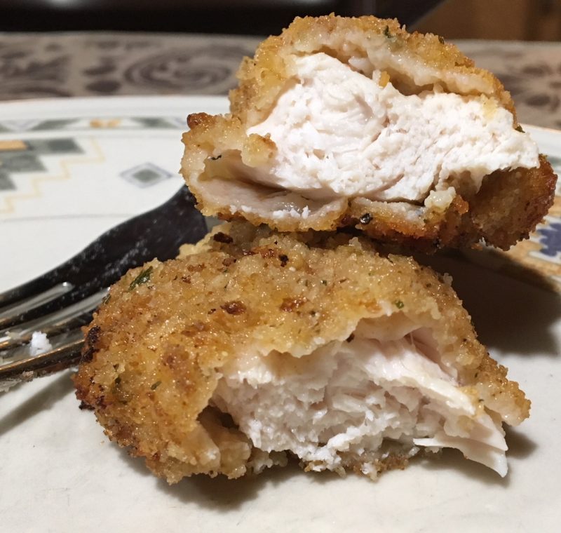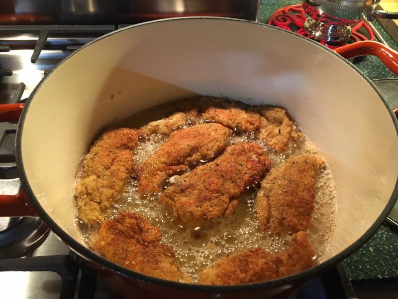 I had to do two batches, and did not have to add any additional oil. Test your oil by dropping a bit of chicken or breading in. Make sure it's sizzling before you add the chicken. Lift it up once you put it in to make sure it's not sticking. Mine didn't stick at all. Cook until golden brown, 8-10 minutes. Turn.