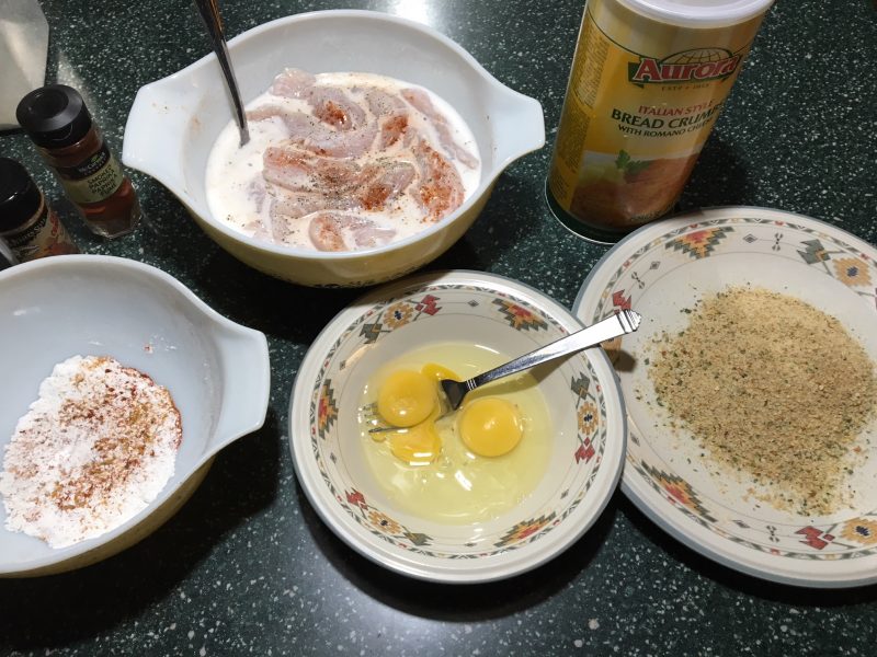Remove chicken from the fridge. Get your breading ingredients lined up. Flour, whisked eggs and breadcrumbs. (This picture does not show nearly enough flour or breadcrumbs. I didn't season the buttermilk and chicken before I put it in the fridge. Oops. It's never too late!