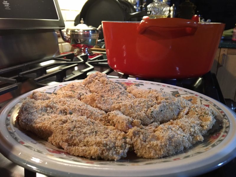 Preheat your Dutch Oven, on 3-4. Not too high. This is the cooking temperature as well. Take the chicken out of buttermilk. Use your fingers it's more fun. Dredge it in seasoned flour, coat it in the eggs, cover in breadcrumbs. Put on a plate. Not long before you're ready to fry chicken, add about 1/2 inch of Crisco Oil to the preheated dutch oven.