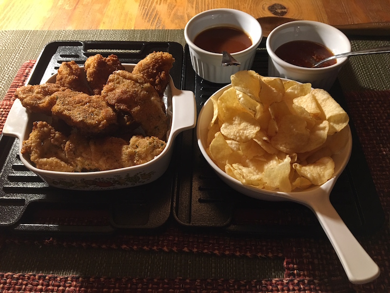 Remove to plate with paper towel to obsorb oil. This isn't oily at all! Serve with dipping sauce and chips... or fries, or salad, or biscuits, waffles, anything you want!