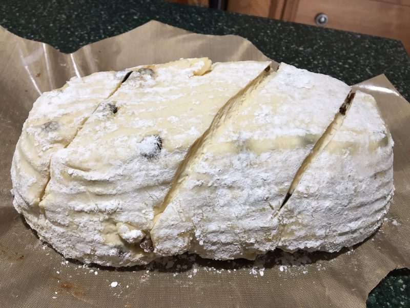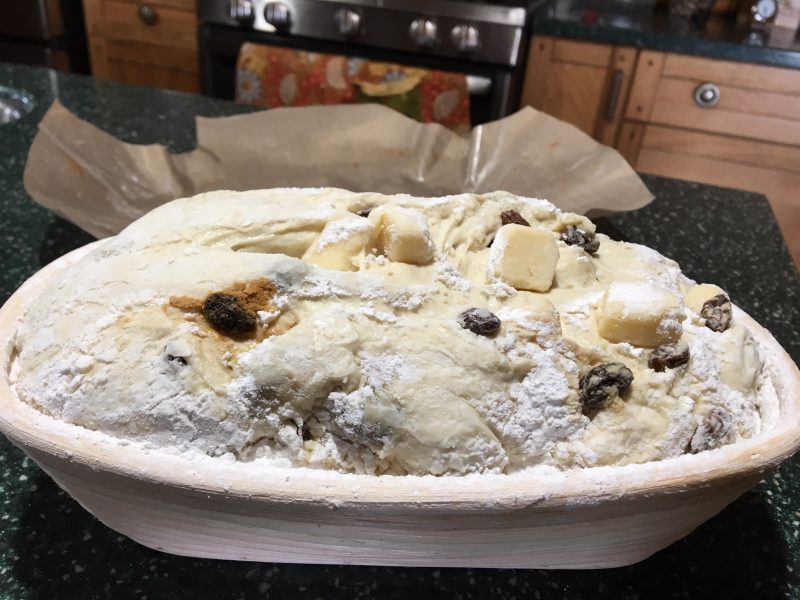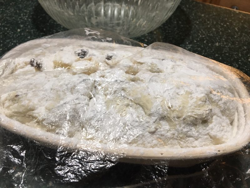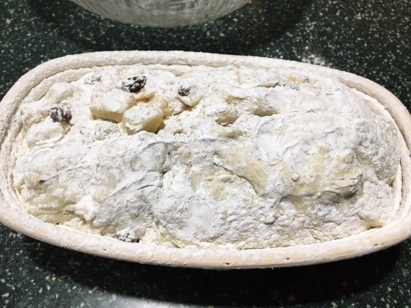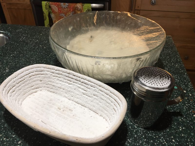Leave the dough on the counter over night covered with plastic. In the morning I gently push it down to remove the air, it will be bubbly!! Keep it in the bowl and shape your loaf. Round is obviously easier to do. I do mine in a loaf shape. Seem side will be facing you when you’re done, (and it doesn’t take a lot of handling to form the shape you want, so don’t over work it.) pick it up out of the bowl with two hands on top only and place it in a floured vessel to finish rising. I use rice flour and I use a banaton. Lift the edges slightly to sprinkle flour around so it doesn’t stick to the walls and flour the top. Rice flour won’t burn and you can brush it off once it’s baked if you like. So don’t be afraid to use it, it’s better than having your bread stick to the sides when you turn it out to bake.