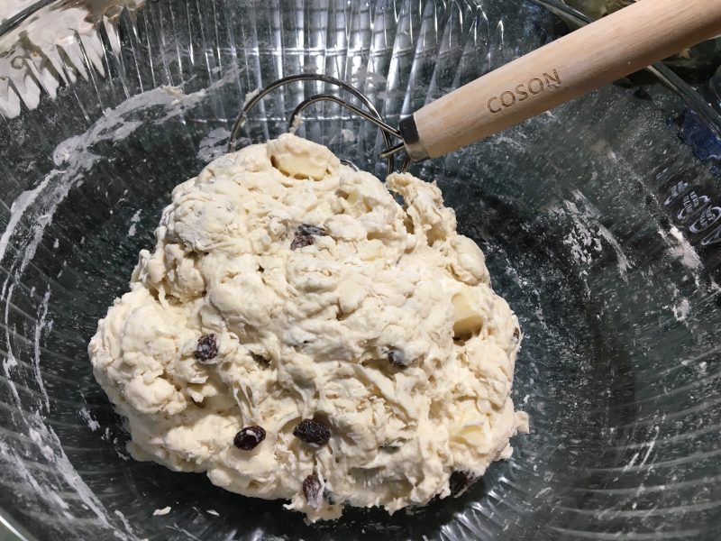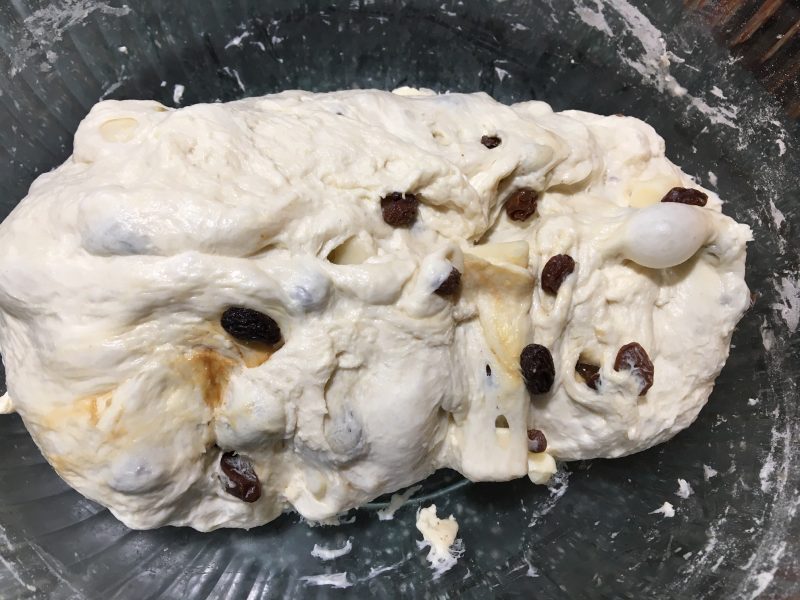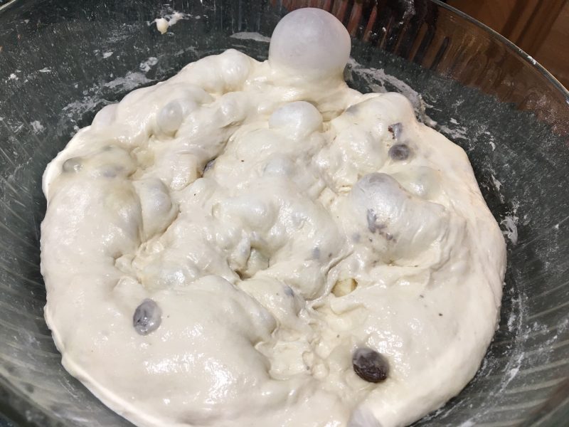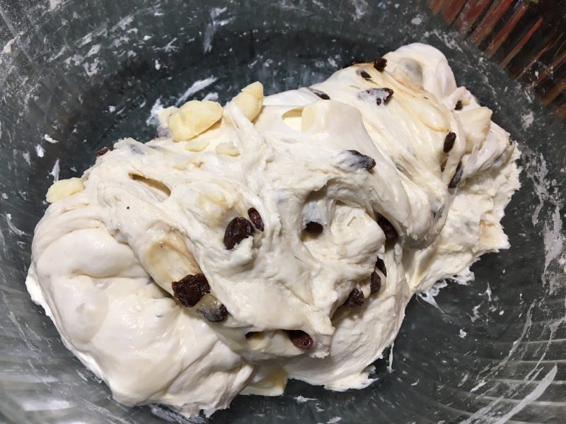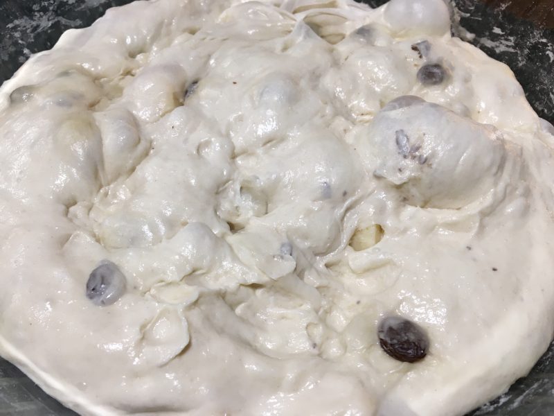 Add 500 grams unbleached flour. I have started using about 100 grams of multi grain, 400 grams unbleached. (This raisin, cheese recipe has no multigrain flour, just unbleached.)