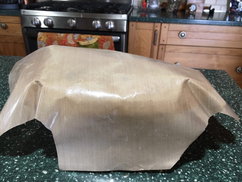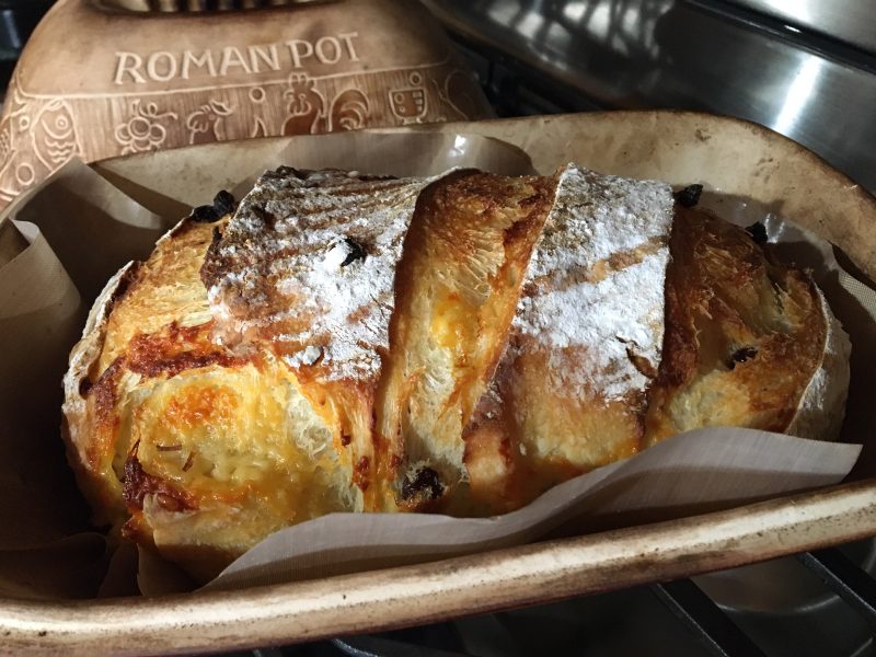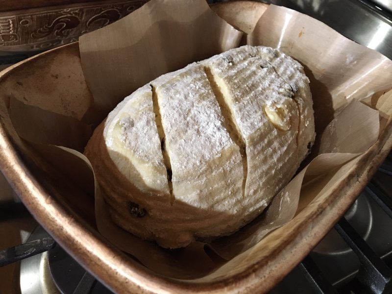 I use a clay baker. Some use cast iron or roasting pans, but I have tried them all and like my clay baker the best. I put a clay pizza stone on the bottom shelf of my oven and leave it there. It evens out the heat and you won’t get a hard bottom crust. I don’t soak the clay baker in water before I use it for bread (I do for all meat I cook). Place it in the oven and then set your temp to 450 degrees. Never put a cold clay baker in a hot oven it will crack.