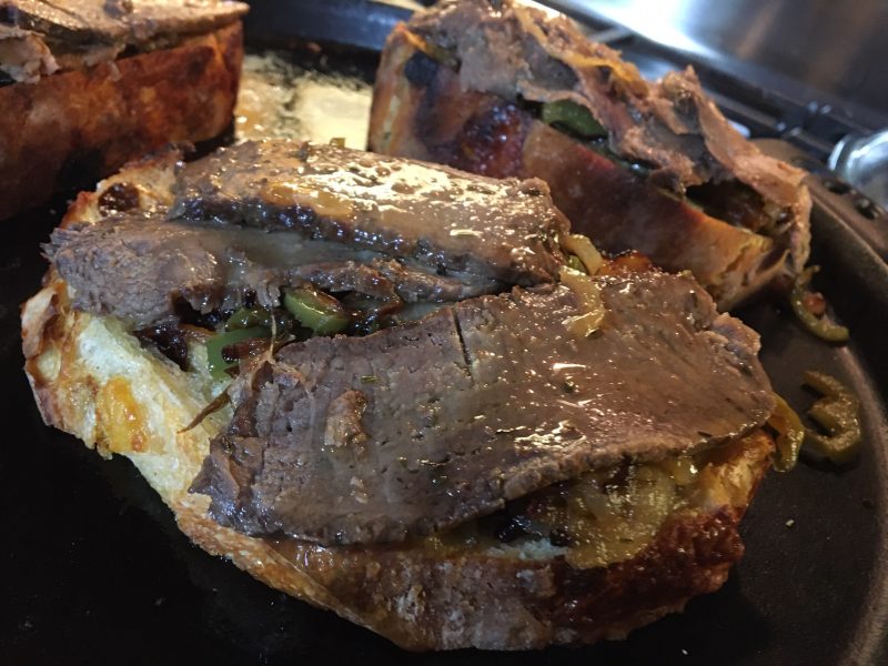 Brush bread with melted butter that you add minced garlic and a bit of salt too. Toast slightly under the broiler. Add onions and peppers, meat, top with cheese and broil. For the au jus, simmer a tbsp garlic butter from the bread, beef stock, thyme, w. sauce, a bit of gravy thickener. Server on the side for dipping.
