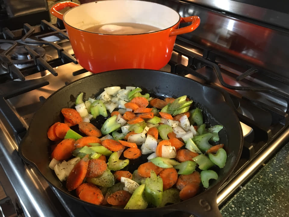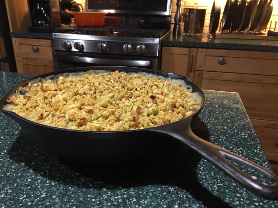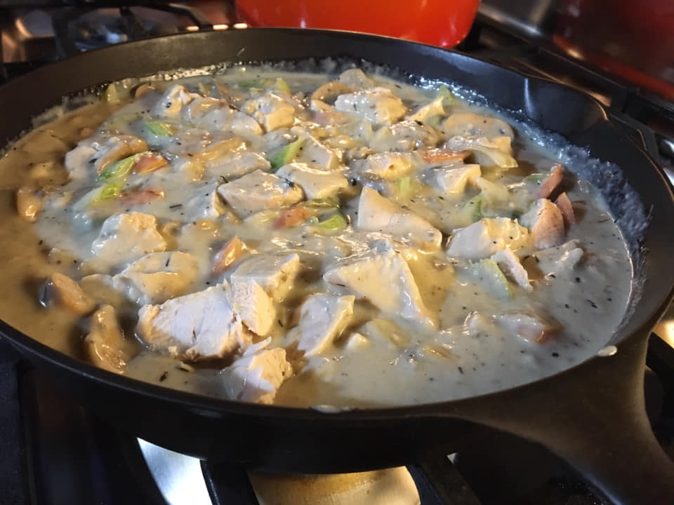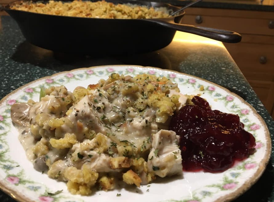 Super fast to make if you’re in a hurry! I didn’t have time to put the chicken in the oven, but you sure could. I boiled three breasts in chicken stock for about 25 minutes, removed from heat and cubed after they cooled a bit. While they were simmering, I sautéed onions, carrots, celery and mushrooms in butter. Add to that 1/2 – 1 cup of the chicken stock used to cook the chicken, about 1/2 cup of milk (or more or you could add cream), 2 cans of cream of mushroom soup (should have been cream of chicken… I didn’t have any so added ‘better than chicken bullion’ to it.) Seasoning was sage, thyme and pepper. I would have certainly put a pie crust top on this if I had more time.. instead, I used 2 boxes of stove top chicken stuffing (I used a number 10 Skillet.. I started with a number 9 but there wouldn’t have been room for everything.)