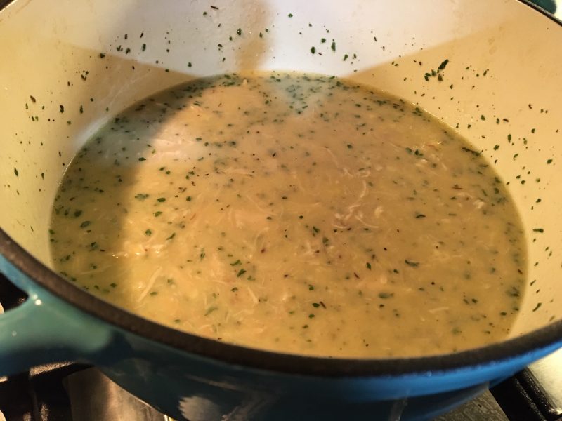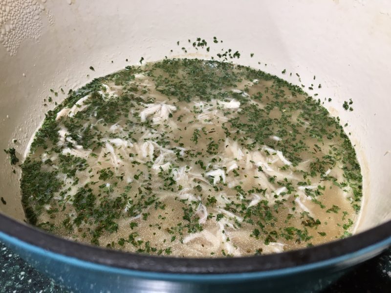 Simmer for as long as you like. When your ready to serve put 5 ounces uncooked egg noodles into the chicken mixture.