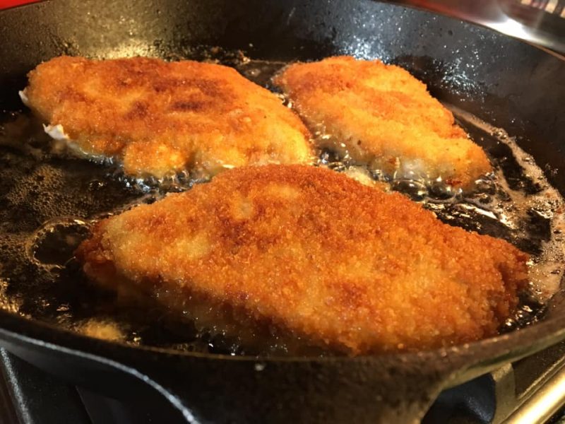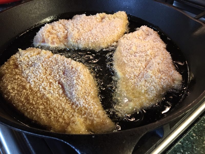 I preheat my 12″ skillet while I’m doing this. Then turn it up to 3.5 to 4 (gas stove). Add Crisco oil (about 1/2″ deep) make sure it’s hot, and add chicken. I move it around in the pan after about 10 minutes to make sure it’s golden on all ends. Fry another 5 minutes or so and turn over to finish cooking.