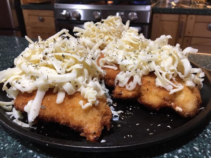 Once it’s cooked, I put it on a griddle, heap mozzarella cheese on each breast and sprinkle Italian seasoning on top of the cheese. Put in the oven at 400 until cheese melts and turns golden brown.