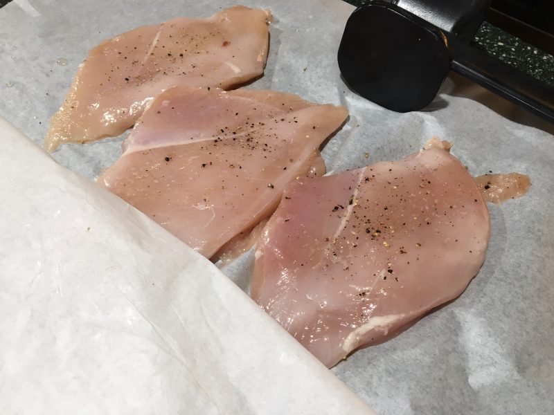 Place chicken on parchment paper, season with salt and pepper. Add a sheet of parchment paper on top and pound so they are all pretty much the same thickness.