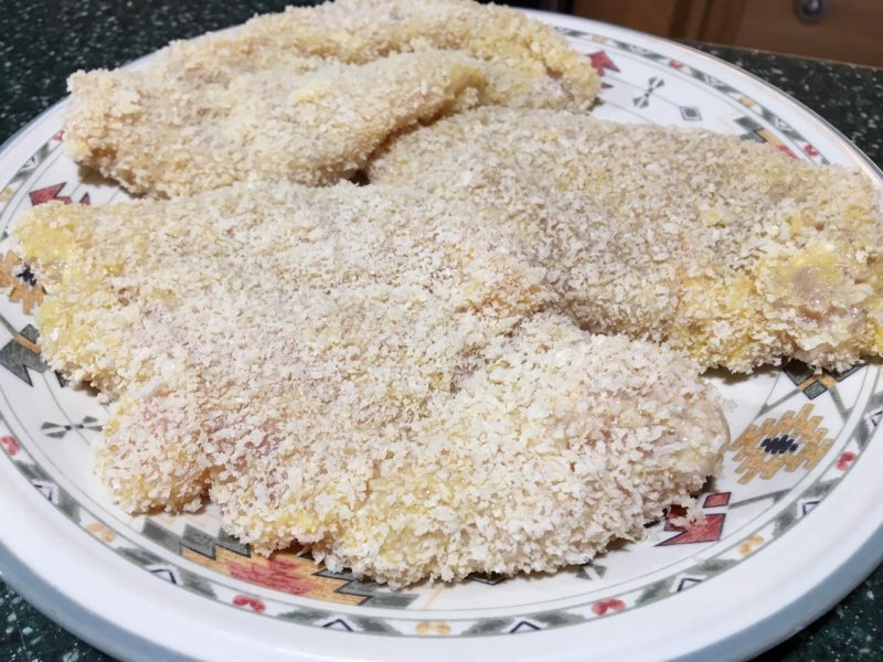 Coat in flour, then dip in whisked egg (one egg was all I needed for these 3 chicken breasts). Completely coat with Panko Crumbs or bread crumbs, or cracker crumbs work fine too.