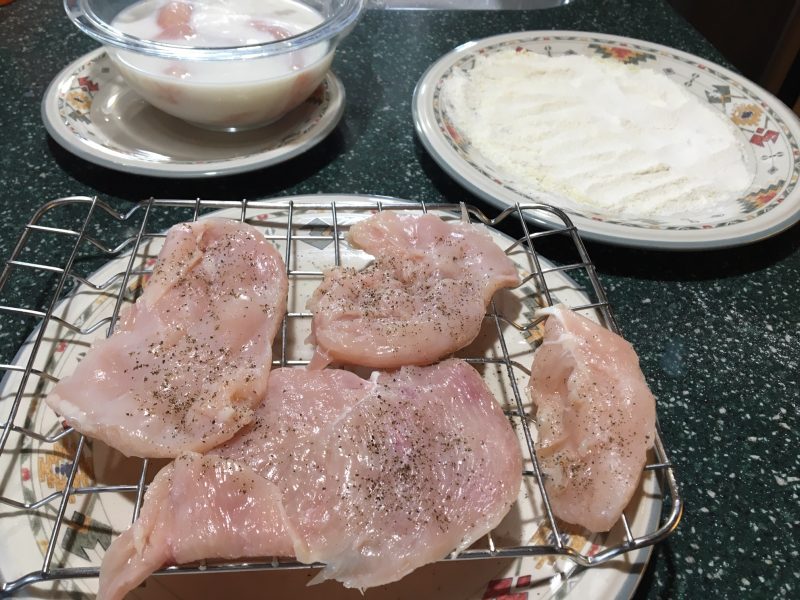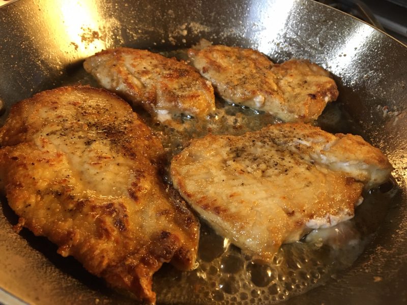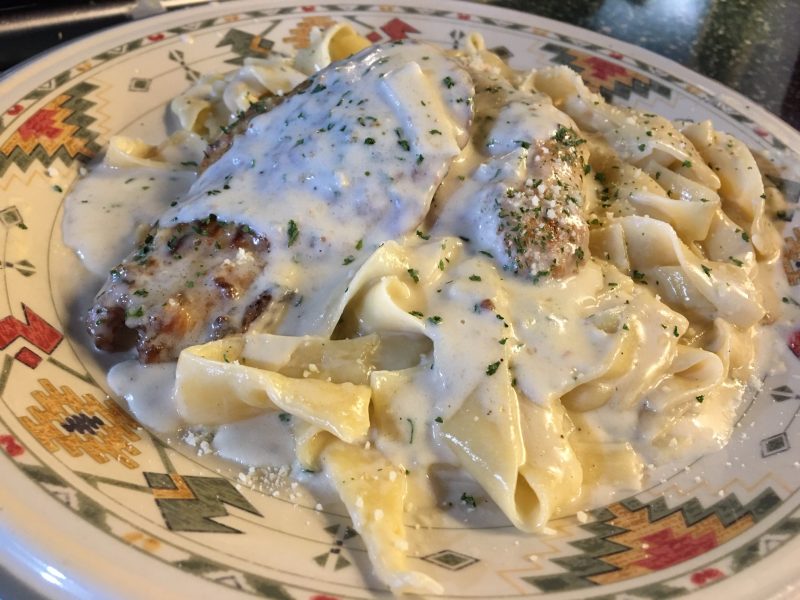 For the chicken, use 1/4 flour and 1/4 cup parmesan cheese, mix. Don’t salt the chicken as there is enough salt in the cheese. Chicken should soak in butter milk, or milk with lemon juice for a few hours. Remove and let drain, then pat the chicken dry with paper towel. Coat with flour/cheese mixture. Heat stainless pan up for a couple minutes, on 2 or 3. (gas range) Add olive oil and butter, add chicken. Set timer for 4 minutes for each side. After 3 minutes on first side, I used a lid to cover the chicken. Flip, used a lid for a minute or two, removed and let finish cooking. (I did filet my chicken breasts before cooking and pounded so they were the same thickness. Best way I’ve found for perfect chicken… ) Remove cooked chicken from pan, cover with tin foil. Deglaze the pan with white wine, get all the brown bits off the bottom of pan, let reduce to half amount of liquid. Add chicken stock, make rue out of flour and butter, add to skillet. This likely should have been done before the stock, but didn’t matter.. let it thicken. I added a bit more broth and some milk. It was not too thick, I added some parmesan cheese then cream. Add chicken back to sauce to coat. Add the noodles to boiling water, set time for 2 minutes. Drain really well. Remove chicken, and add noodles to cream sauce, evenly coat them. Add back chicken. Plate. Garnish with parsley and more cheese? Yes.
