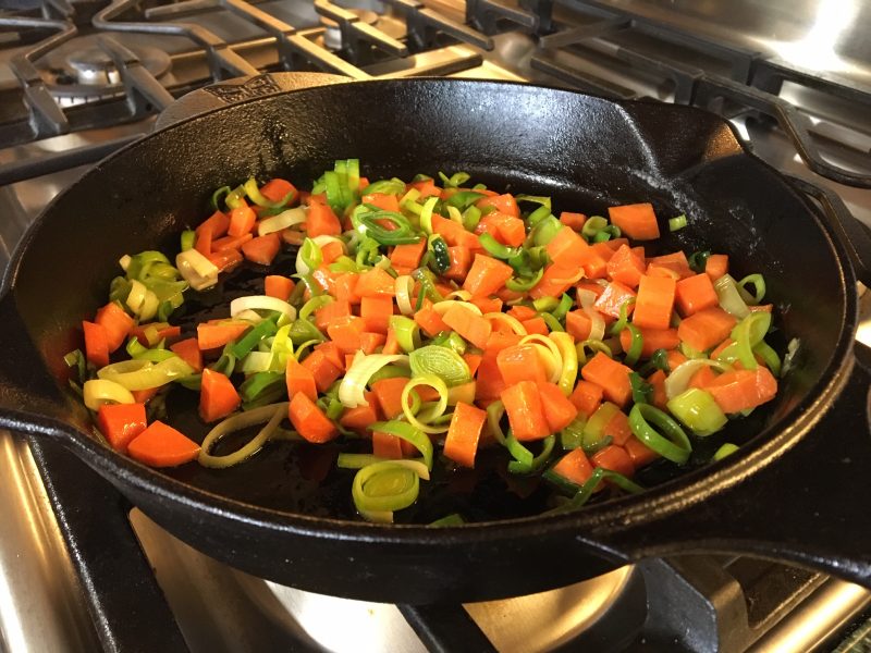 In as cast iron frying pan, add butter, 3 leeks (washed and chopped, I didn’t use the large outside parts of the leeks) and 2 carrots diced. Sautee until tender. Add frozen peas.