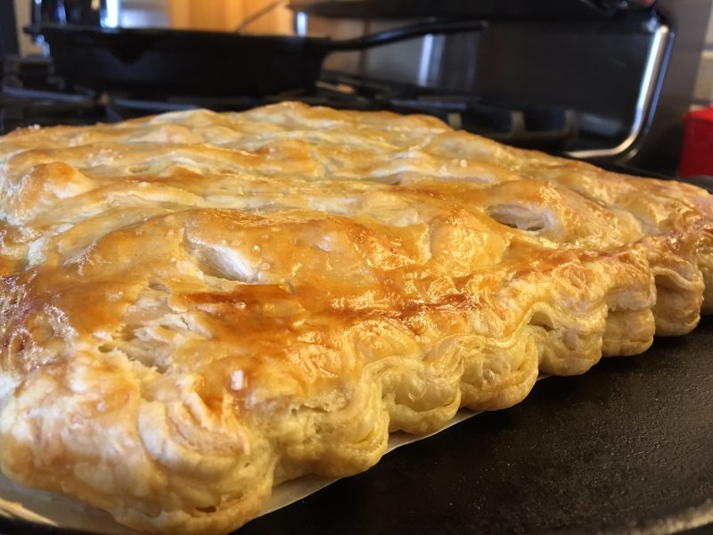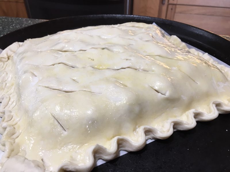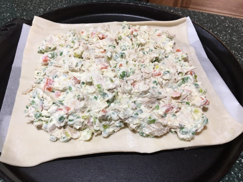 Place one of the sheets of puff pastry down. Mine were almost still frozen, just barely able to roll it out. This gave me time to work with it before it got soft. Add filling to centre area, leave about an inch of nothing all around the edges, use a beaten egg to brush that area, place top puff pastry on, seal edges, I used a fork then crimped and rolled the corners in.