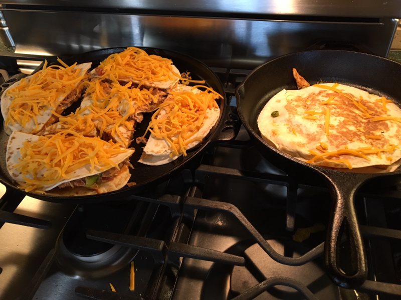 I just winged this!! I had shredded chicken already so I mixed it with salsa and cheese whiz and quesadilla dry mix, and warmed it up so it was not cold when I put the quesadilla together, added chopped sweet onion, green pepper (not sautéed) to the mixture. Pre-heated the 8″ skillet put the bottom wrap down, added chicken mixture, and shredded cheese. Put the top on, browned then flipped it over. Moved it to a CI pizza pan, covered it in cheese and baked for 10 minutes at 385, then on hi broil for a minute or so… topped with hot green chiles, diced tomato and sour cream.