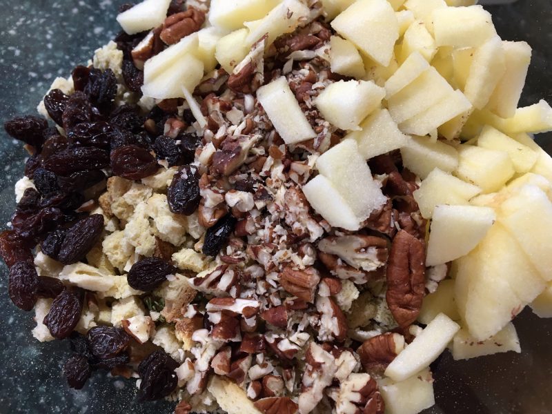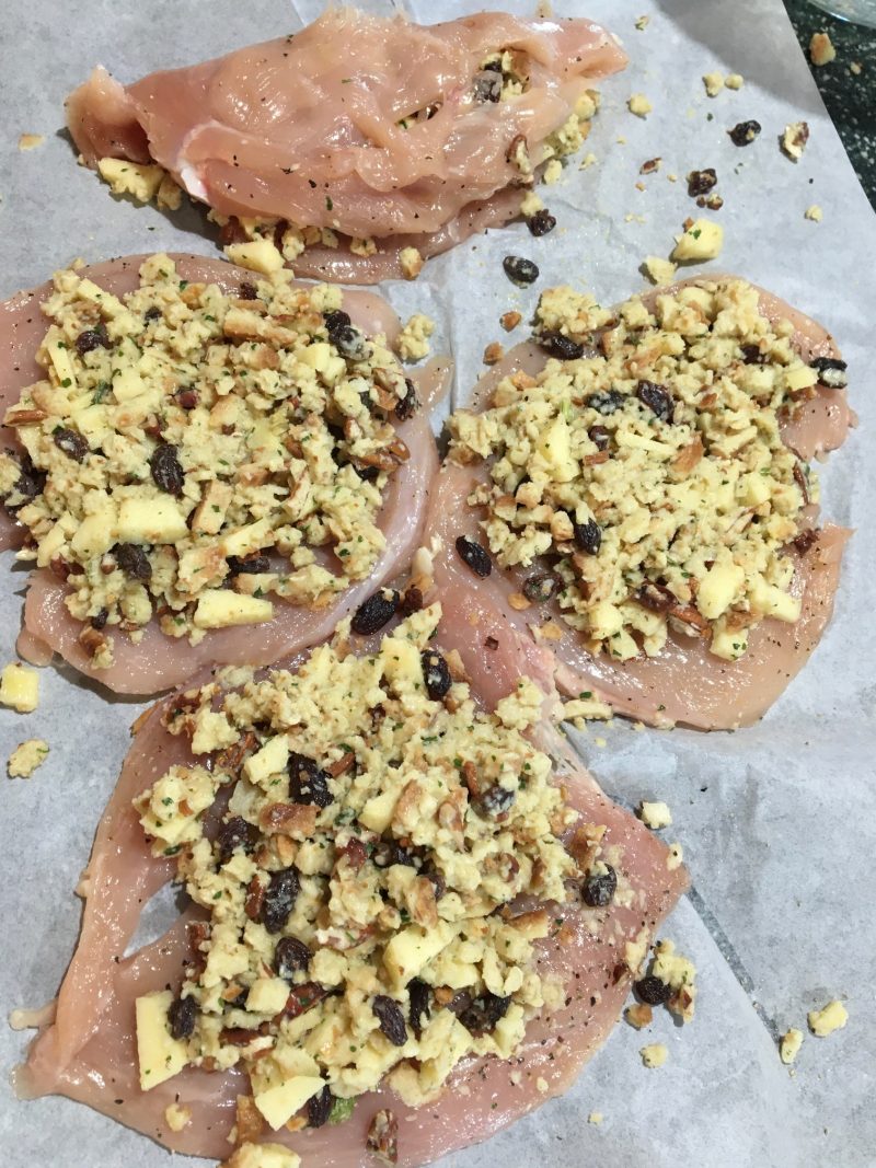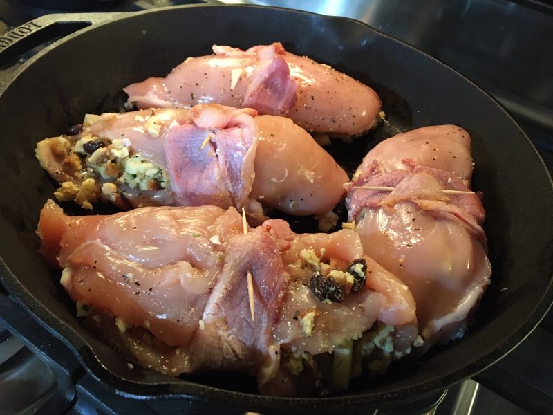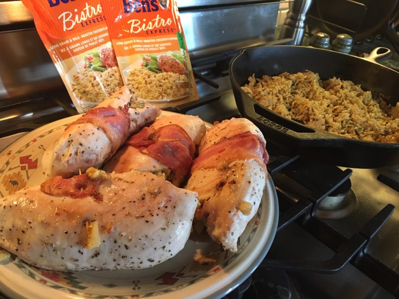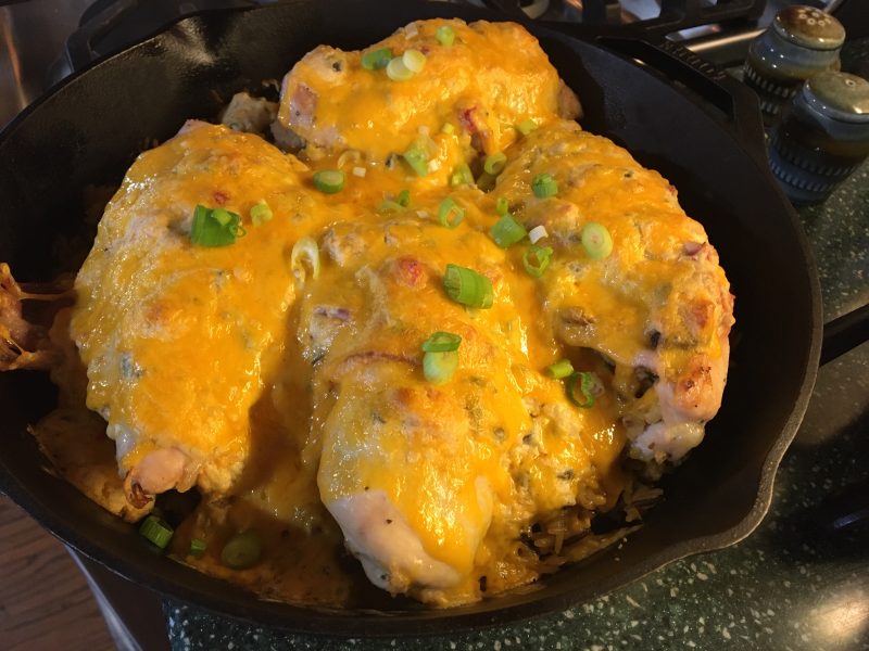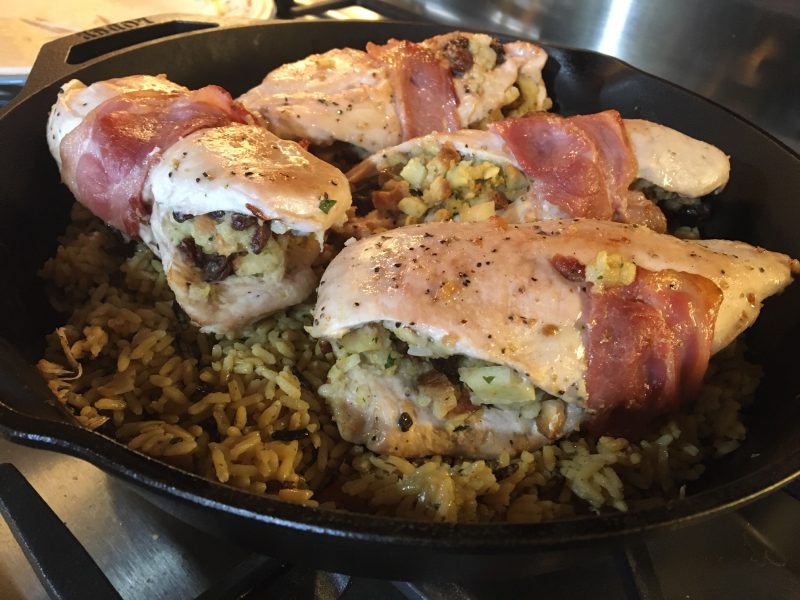 I used a no. 12 Lodge, fried some bacon until almost done. Stuff the chicken breasts with Stove Top stuffing that has been mixed with finely chopped apples, pecans, raisons and enough milk to moisten the stuffing mix. Place stuffed breasts in the skillet, which has some nice bacon grease in it. Coat lightly with olive oil or melted butter (oops I forgot this step.) Cook quickly in a 400° oven, turning once. This took 30 minutes. When the chicken is cooked to 160°, internally, remove from the skillet and add 2 packages Uncle Ben’s Bistro Express Long Rain & Wild Roasted Chicken flavour rice (or what ever you like) to the skillet, add the chicken back. Cover each breast with Queso Dip, I used one from Costco, (la terra fina) I was pretty generous and then wondered if it would be too spicy. It really wasn’t because of the sweetness the raisons and apple gave from the stuffing. I think I’ll use cranberries next time on the side as well. Cover with shredded cheddar cheese, back in the oven at 350 for about 15 minutes. The Queso Dip mixed in with the rice. It was just awesome!! Thanks Debbie!