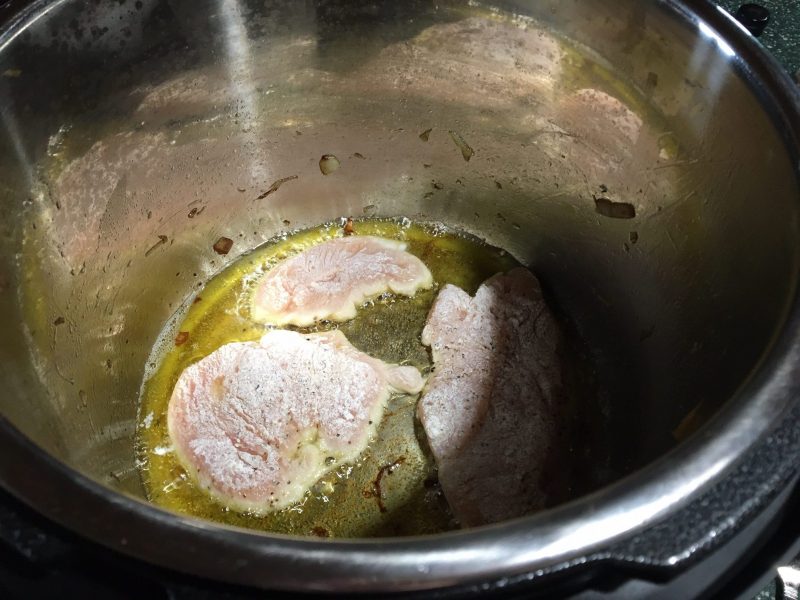 On sauté, add oil and some butter to cover bottom of IP. Add chicken. Set timer for one minute on each side. Remove to plate.