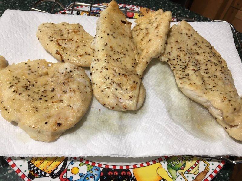 1 chicken breast (this actually feed the three of us!!) sliced thin, and pounded a bit to make sure they were all the same thickness. Lightly salt, pepper, onion powder, flour. Shake off excess flour.