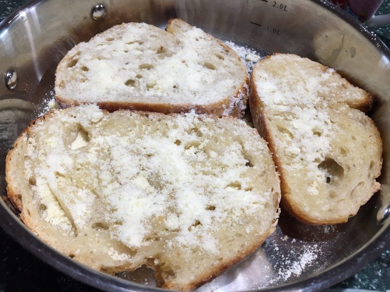 Put garlic bread in oven at 425 to toast, turn. Remove from oven. I put them in a deep skillet, topped with parmesan cheese.