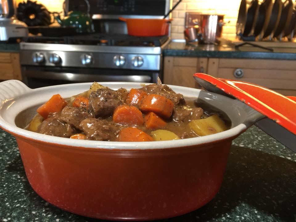 Add some vegetable oil to a dutch oven, heated on setting 3 of my stove, when it’s hot add beef, and about 1/3 cup of flour on top. Add spices on top of the flour. Salt, pepper, onion power, garlic powder, smoked paprika. Mix in with meat (you can also add the flour and spices to the meat before you put it in the oil, that’s how grandpa did it, but I’m getting lazy and this way works just as well. When it is browning, turn heat to 2 and add beef broth. Simmer on the stove until very tender. I left it there for about 4 hours. I forgot onions and garlic so fried some up in another cast iron pan in bacon and added it to the gravy when I added the cubed potatoes and carrots. I also added a package of gravy mix to thicken it up instead of using more flour. Gives it more flavour. Simmer another half hour or so until vegetables are tender. Serve with toast and butter like Grandpa did or garlic toast if you prefer.. or salad.. I’m sure he would have made a salad to go along with this!!