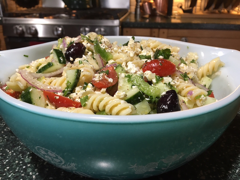 I’ve made this twice now. I didn’t like the dressing on my finger, but loved it on the pasta salad!! Next time I will add some finely crumbled feta cheese to it and let it sit a while. (Did this and it’s much better.) This would be very easy to make ahead of time and bring as a side dish to a BBQ, or at home with.. anything! I keep thinking sausages for some reason.