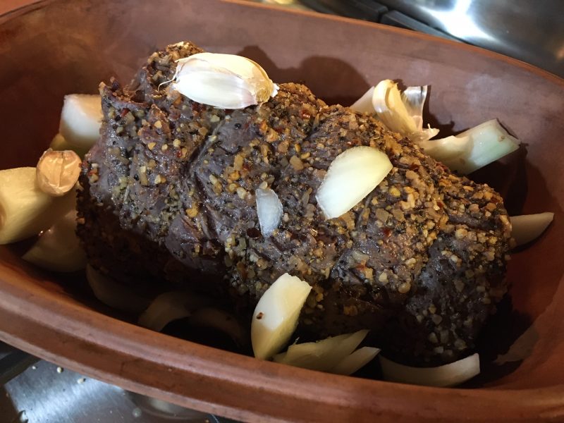 Soak the clay baker for 10 or 15 minute, then turn the oven on to 500 degrees. I add the baker when it’s preheated to about 150. Once it gets to 500 degrees, leave the clay baker in there 10 minutes, remove, put roast in. (Don’t add anything to it.. no water, no fat) put the lid on, and back in the oven it goes at 500 for 15 minutes.