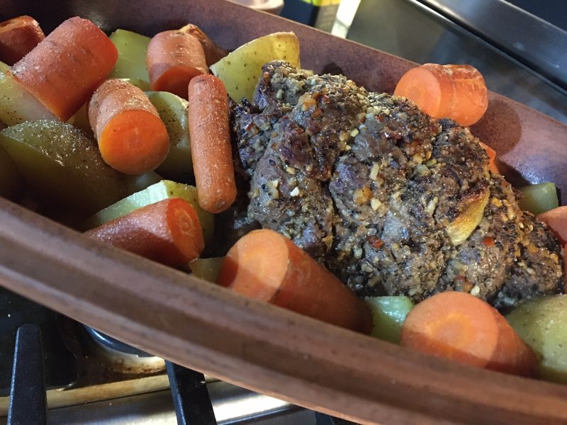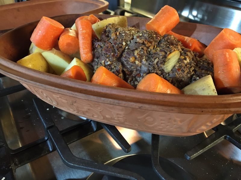 Return vegetables back to clay baker, turn the oven to 450 and let them brown up a bit while the roast is resting and you make the gravy. I used a package of brown gravy mix, mixed with a bit of water, whisk it up and add to the saucepan of roast juices. Keep stirring while it thickens.