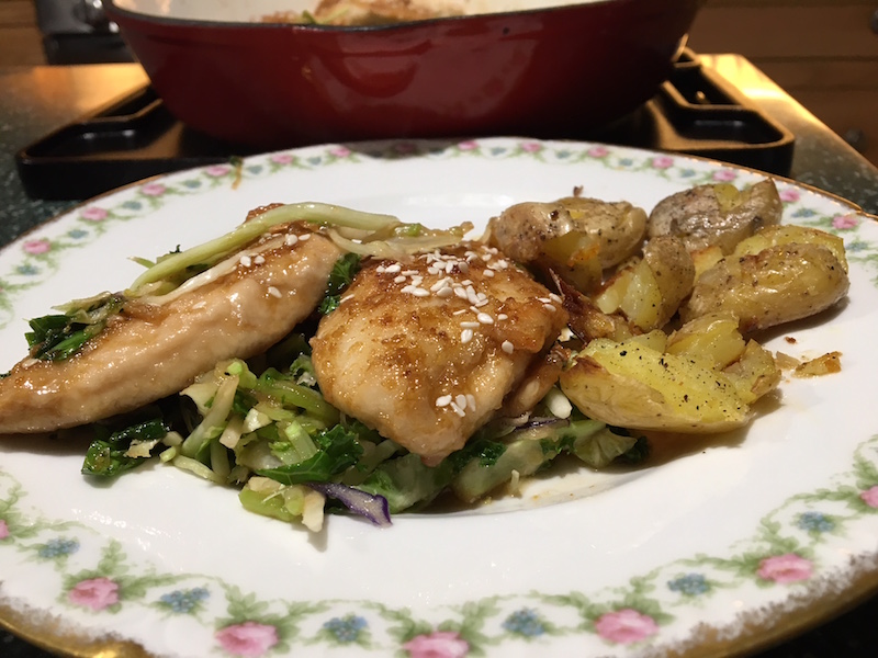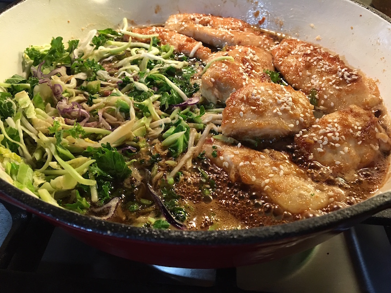 Pour over chicken, move to one side of skillet, add chopped kale or any greens you like till just done. They pick up the sauce from the chicken.