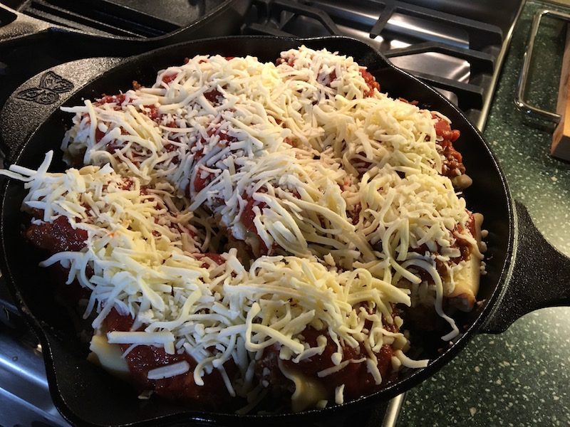 Add some olive oil to your 12" Cast Iron skillet. Then add some marinara sauce to cover the bottom of pan.