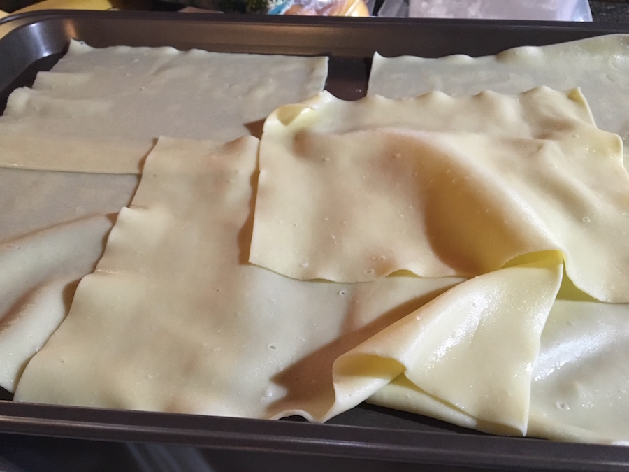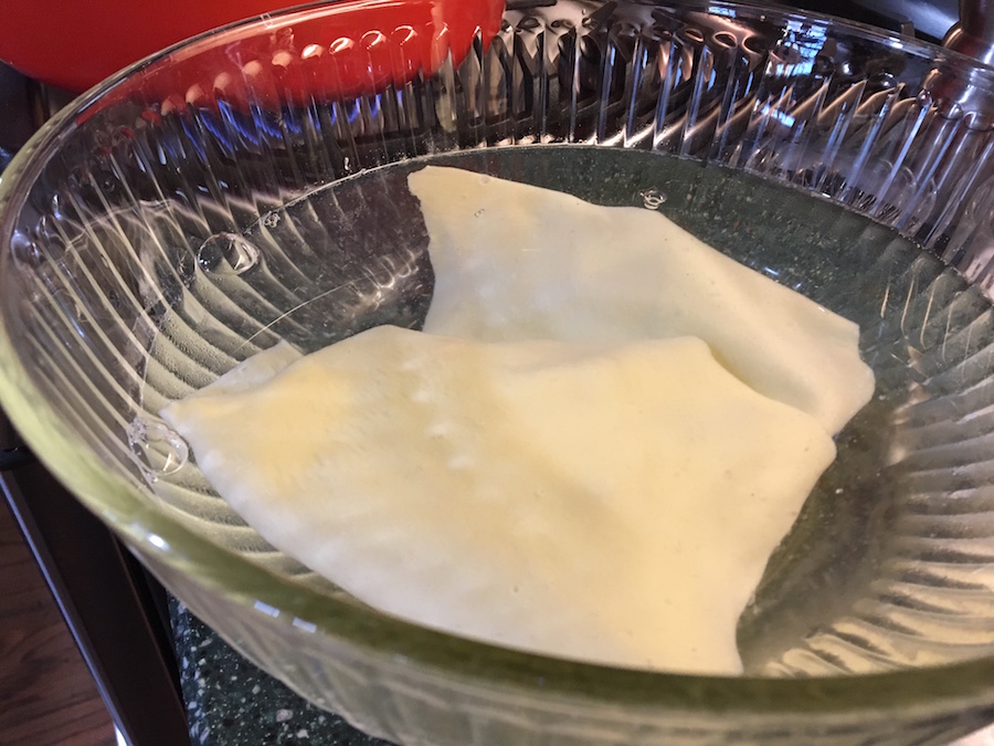 As I cut the pasta sheets, I put about 3 – 4 at a time in boiling water. Just long enough for the water to come to a boil again, take them out with a strainer, plunge into ice water and lay on a cookie sheet, cover with tea towels.