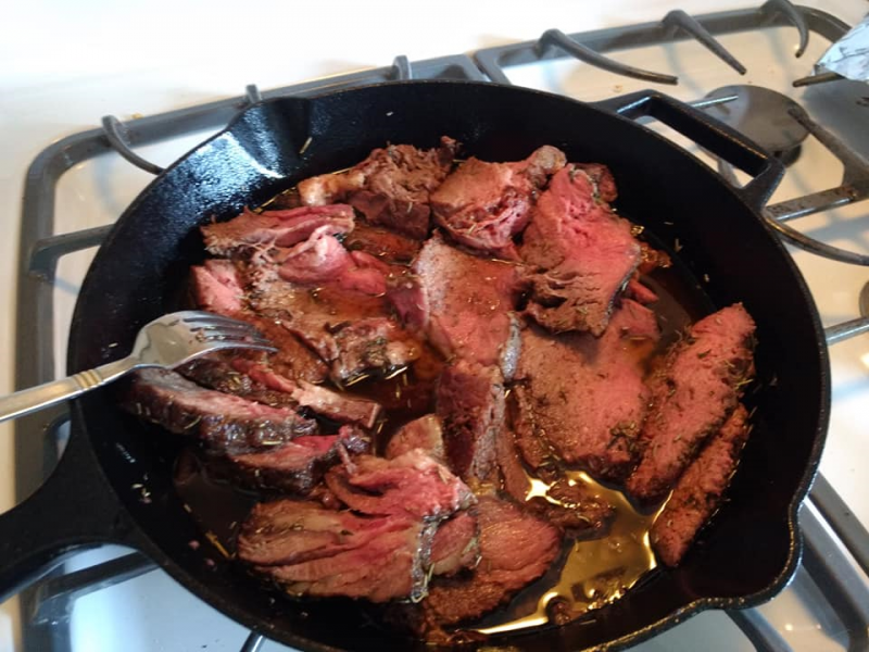 After cooked, let it rest with tin foil on top for 20 minutes, sliced it and put back on the pan and serve.