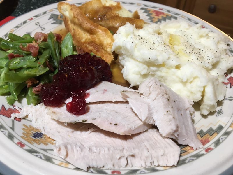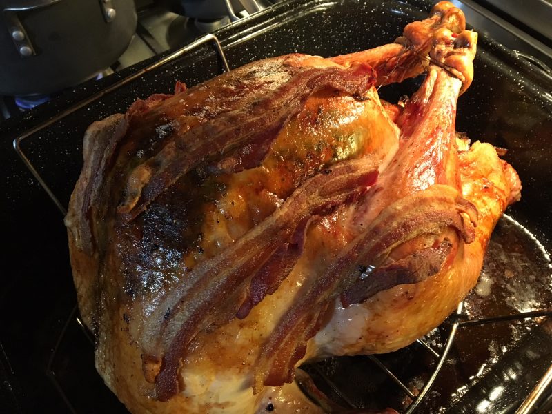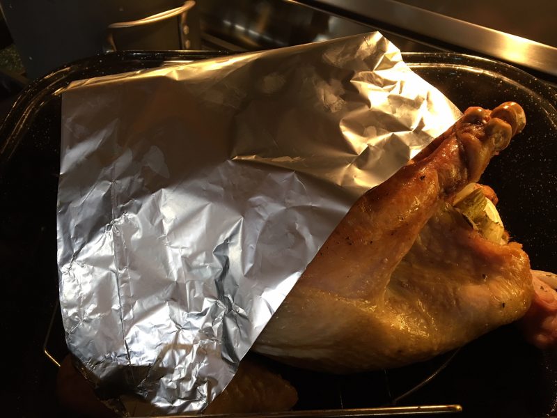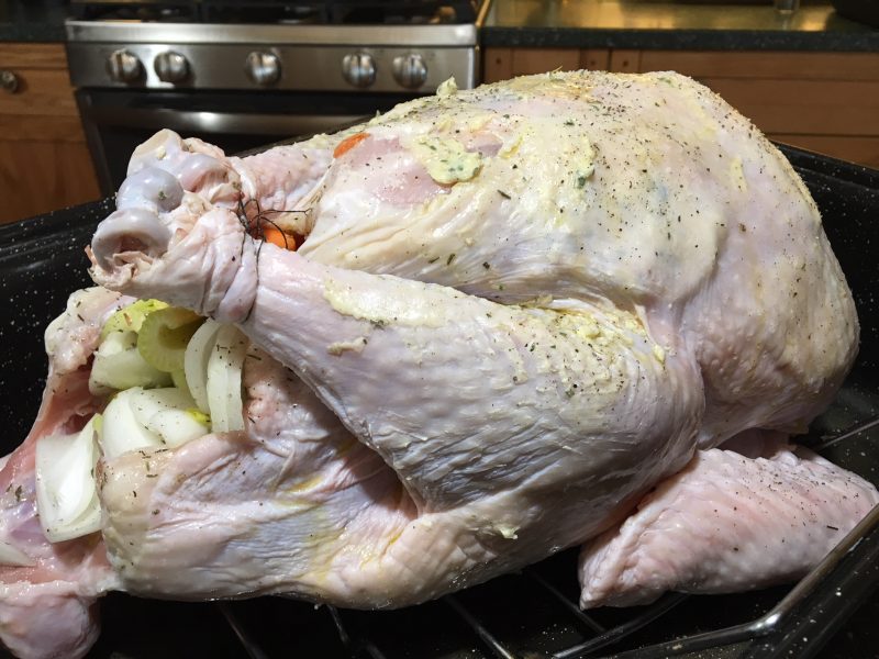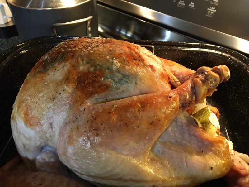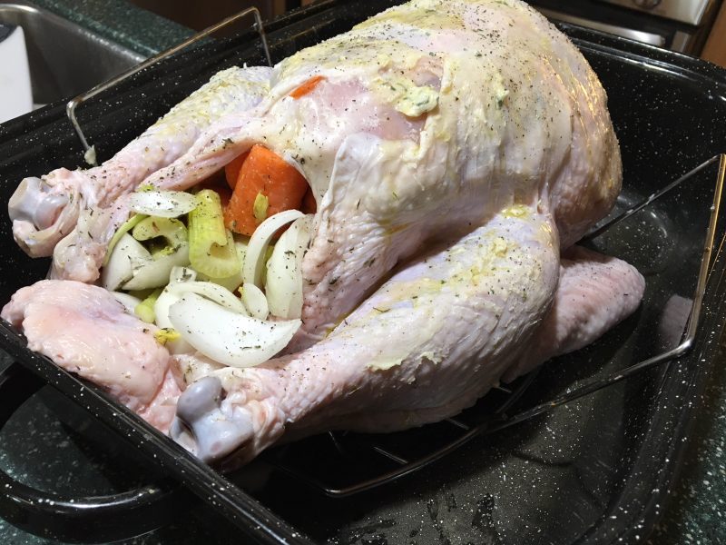 I’d add about an inch of water, put the turkey in, put the lid on and it came out ‘steamed’ every time. Yes it was great and the pan drippings made amazing gravy, but this time I thought I’d truly try to roast it. No cover. No water in the pan!