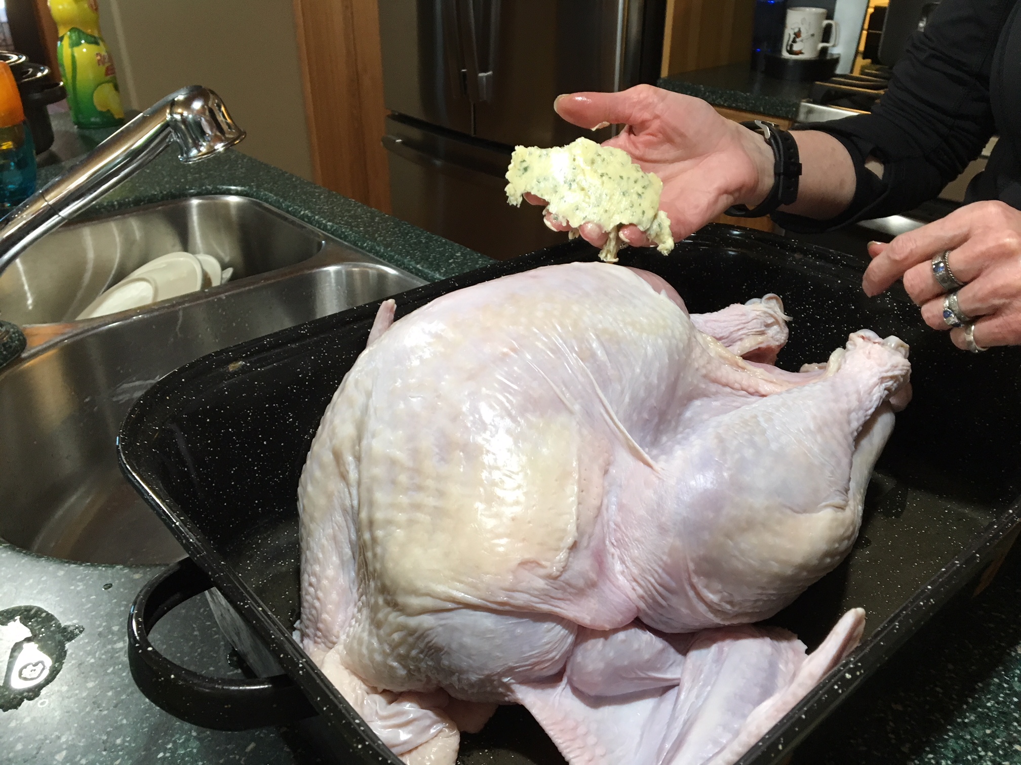 Rub excess butter from your hands all over the outside skin of turkey. Stuff with the vegetables.