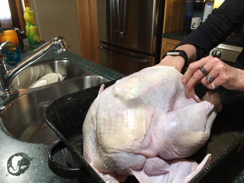 Tie legs together like Grandpa Campbell used to do using thread! Tuck the wings under bird. Please on turkey rack inside roasting pan.