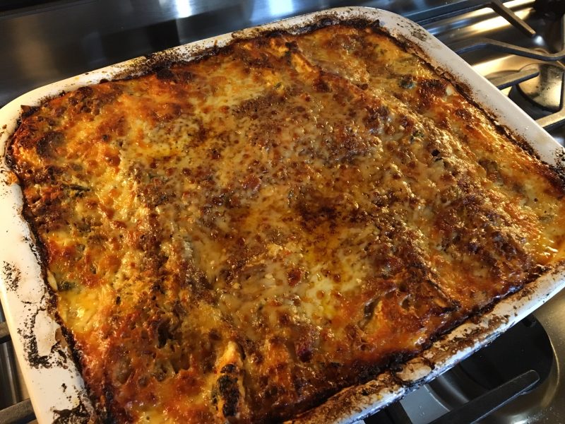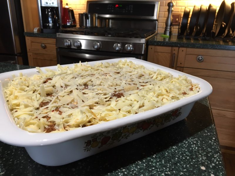 Top the final layer of cheese mix with the mozzarella sheets and finally a little of the bolognese for color. (I did’t have the mozzerella slices, so used grated Monterey Jack all around the outside, right to the edges of pan, and freshly grated Parmesan cheese over all the middle.